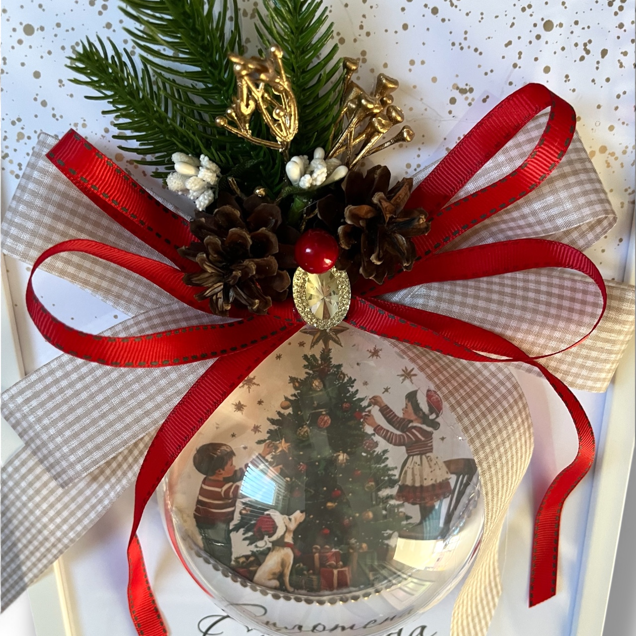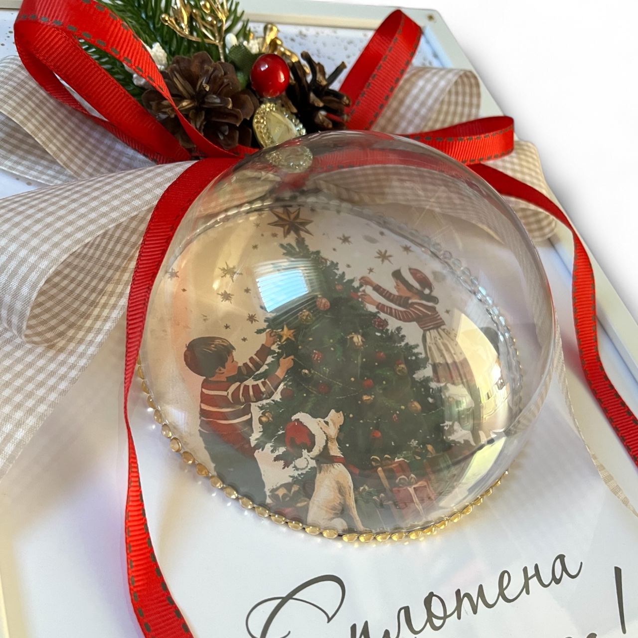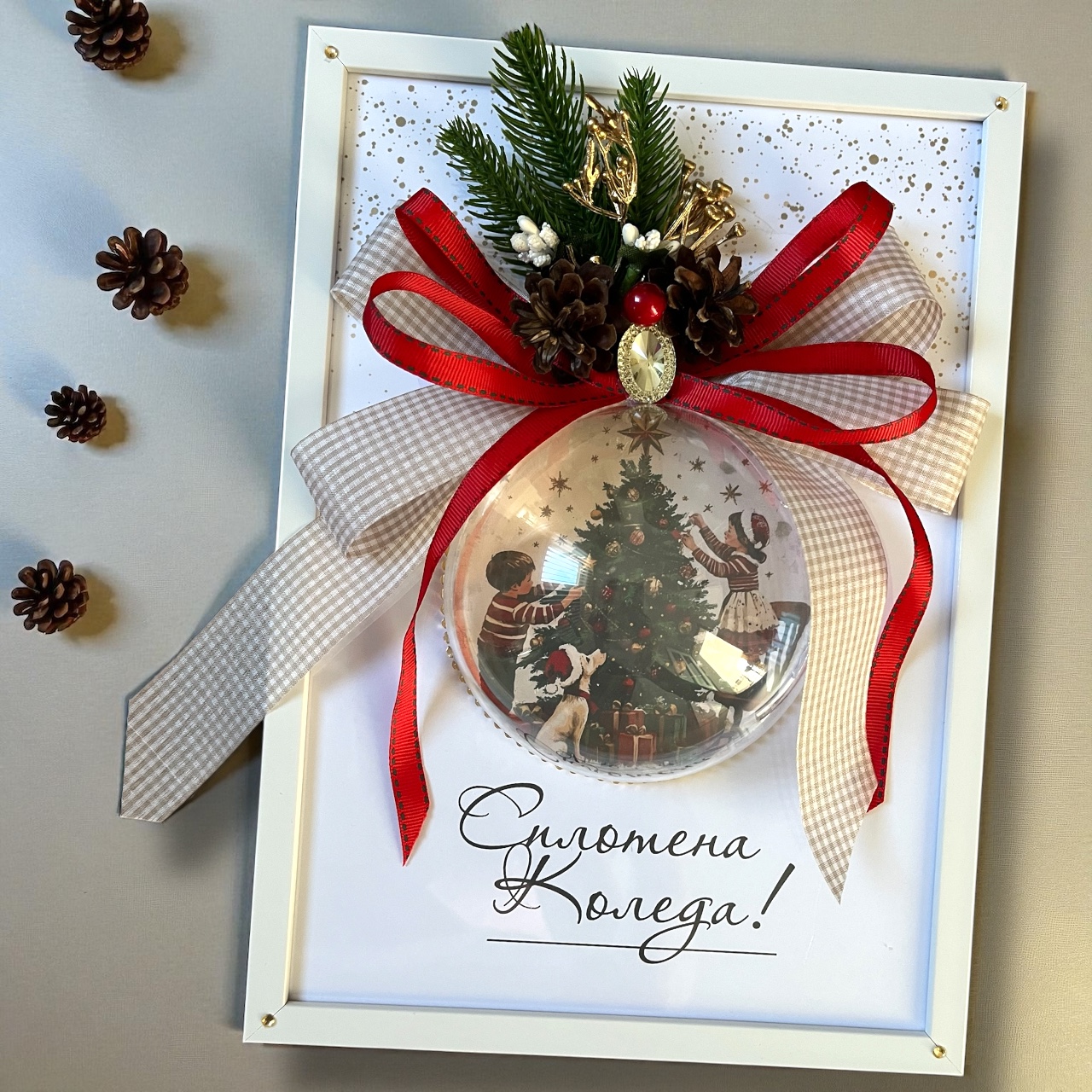 дървена рамка, дизайнерски картон, акрилна полусфера, сатенена панделка, изкуствени и естествени декоративни елементиЕкспресна доставка в цялата страна с куриерска фирма Спиди.